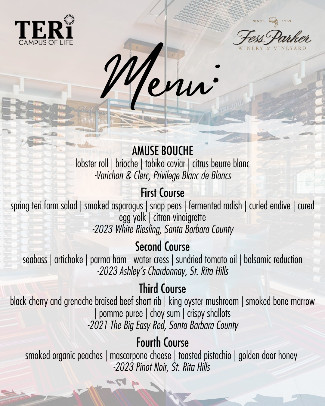Join us for an elegant Fess Parker Wine Dinner Experience featuring an amuse bouche and a carefully curated four-course meal, each dish artfully paired with exceptional Fess Parker wines. Savor an evening of fine dining, rich flavors, and award-winning wines.